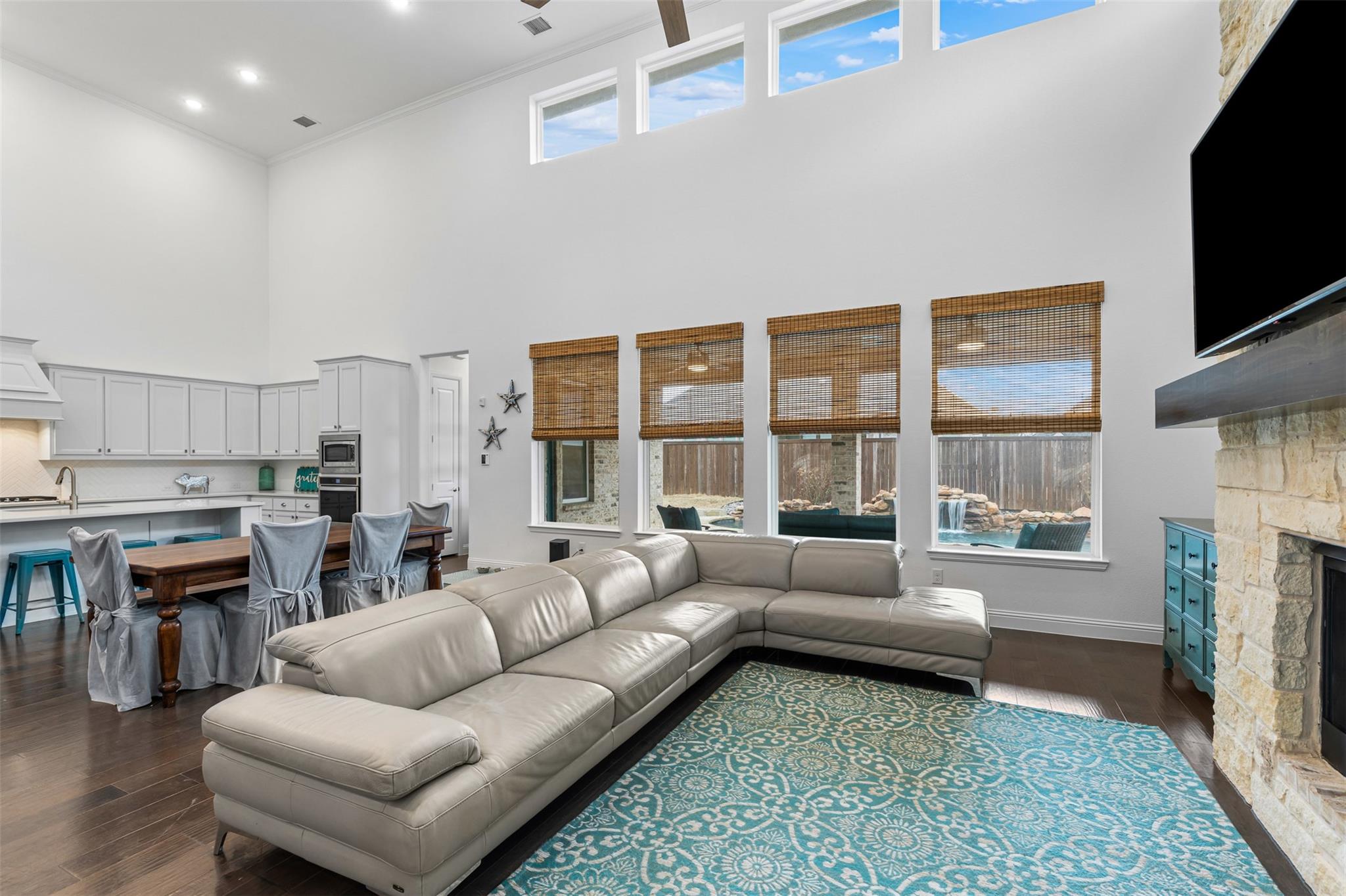 Luxury, comfort, & thoughtful design come together in this one-owner home located in the prime Rockwall location of Gideon Grove! Offering 4 bedrooms, 4.1 bathrooms, & 3,684 sq. ft., this stunning residence is designed for both everyday living & elegant entertaining. The downstairs layout features a dedicated office, spacious primary suite with direct laundry room access, a guest bedroom with an en-suite bath, & a half pool bath for added convenience. The inviting open air living room includes a surround to ceiling stone gas fireplace, complemented by rich hardwood floors throughout. The chef’s kitchen is a standout with stainless steel Whirlpool appliances, quartz countertops, & ample storage.